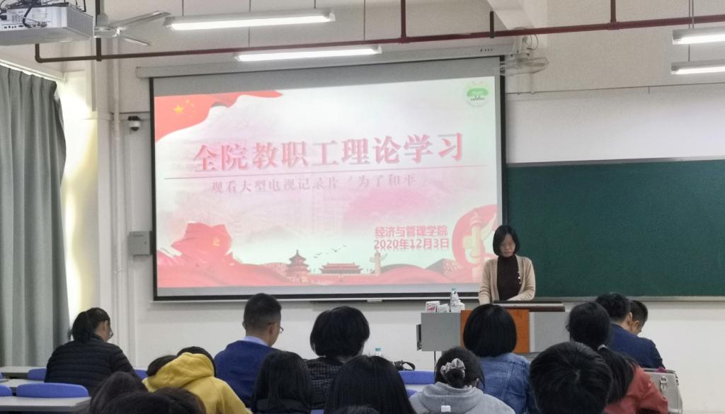 12月3日,经管学院组织全体教师观看大型纪录片《为了和平》。2020年9月27日,中华大地敞怀迎回第七批志愿军烈士遗骸。在时之际,《为了和平》大型电视纪录片通过大荧幕,在回述历史的过程中穿插经历者的回忆,缓缓推开“抗美援朝”的历史卷轴。