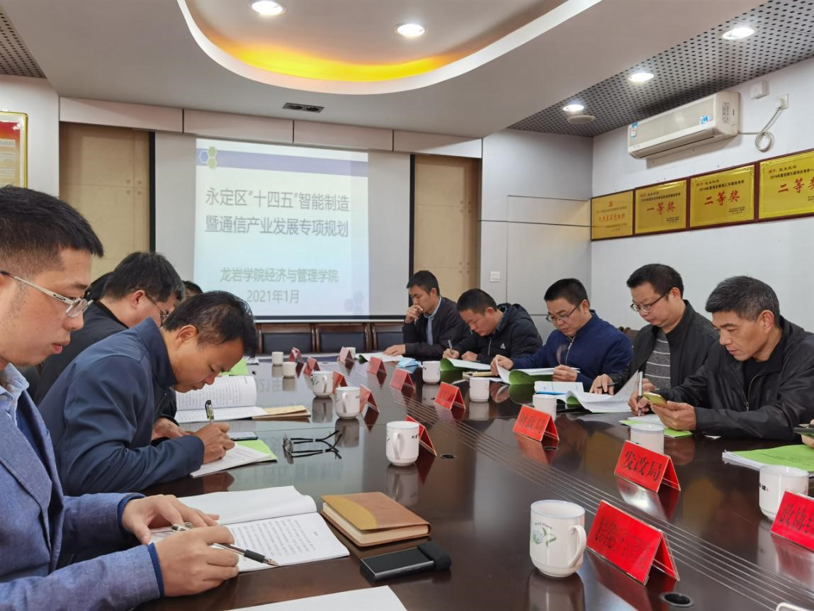 1月28日上午,永定区“十四五”智能制造暨通信产业发展专项规划汇报会在永定区政府六楼会议室召开,经管学院副院长郑国诜带队参会并代表课题组做汇报。会议由副区长罗天进主持,人大财经委、政协经科委、发改局、财政局、工信局、自然资源局、住建局、生态环境局、林业局、商务局、永定工业园区管委会、文秀产业园管委会办公室、龙翔公司等区直单位(部门)分管领导参会。听取规划汇报之后,与会者对规划作出了充分的肯定并就一些细节提出了意见,罗副区长总结认为,在吸收前面几次修改意见基础上形成的本次规划稿已比较完善,希望进一步对接上位规划,策划生成一些新的项目。