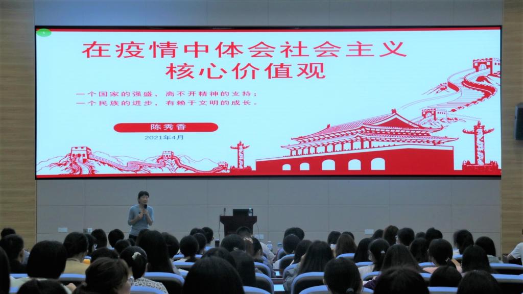 陈秀香首先通过播放短视频《农药残留》向同学们说明社会上某些人价值观出现问题,为了自身利益,不顾人民健康,进而引出社会主义核心价值观的重要性,并带领同学们深刻认识社会主义核心价值观的内涵。陈秀香指出,西方国家和我国在疫情阶段时,因为价值观的不同,造成两种截然不同的结果。西方国家宁可不要人民的生命,也要经济和自由,导致死亡人数仍在上涨。而我国却始终把人民的生命放在第一位,主动给国家经济按下了暂停键,最终控制住了疫情。