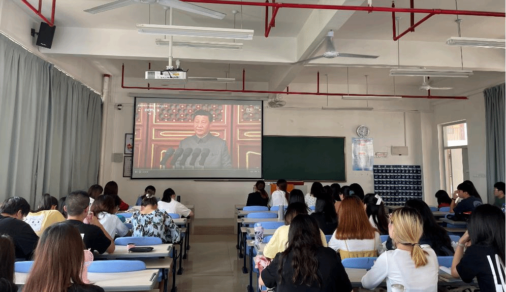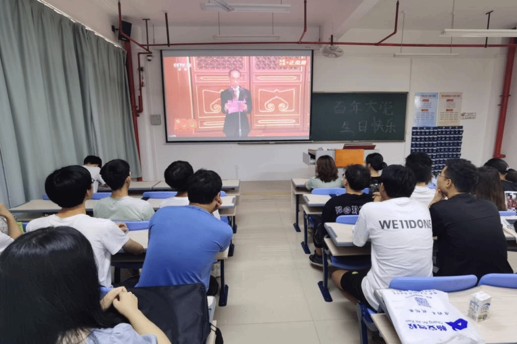 18市营和19旅管的学生在厚德楼401、402集中观看习近平总书记在庆祝中国共产党成立100周年大会上的讲话直播,其他学生党员在实验室或在宿舍观看直播。