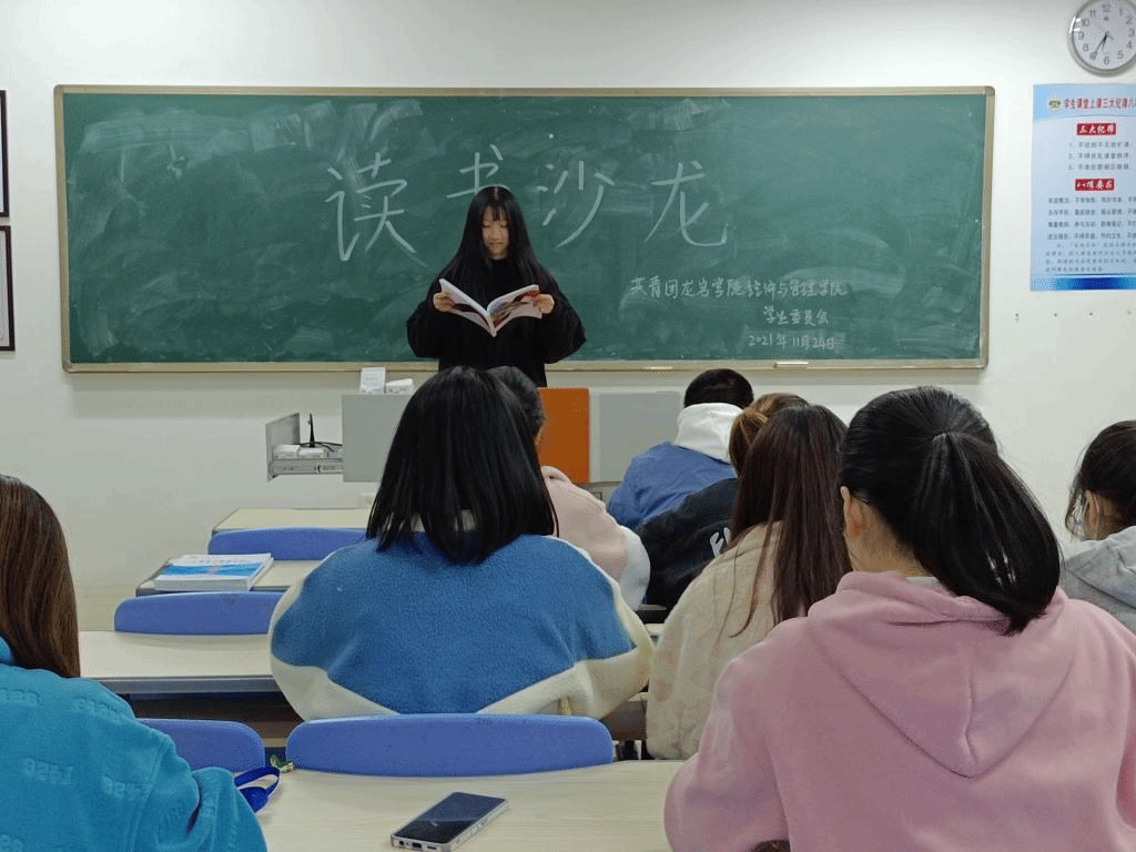 本次活动以导读会的方式进行,读书社成员在活动现场阅读有关书籍并进行分组讨论。讨论结束后,黄晶晶、林凤琴两位同学上台对自己喜欢的段落进行朗读分享,并与读书社成员交流读后感。活动最后,苏佳蓉同学对本次经典导读会进行总结。