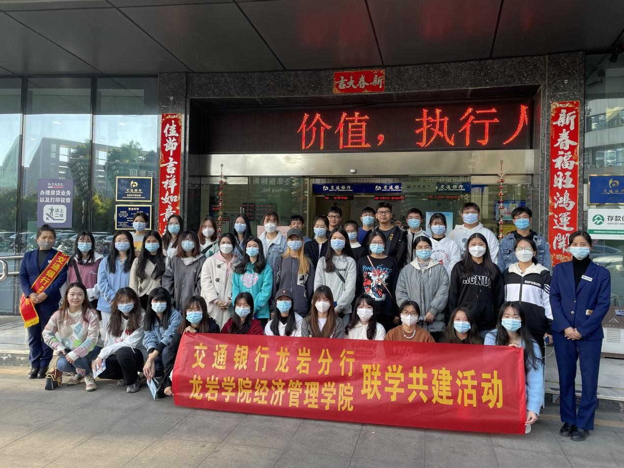 为使学生初步了解银行基础工作和日常工作内容,对银行业工作内容有初步概念,助力学生今后对投资、理财等方面的理解和学习,11月26日下午,经管学院20级投资班由林晓悦老师带队参观交通银行龙岩分行,进行联学共建活动。