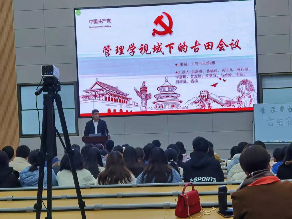 本次公开课是黄可权主讲《管理学》所进行的本学期最后一场分组汇报考核会。工管2021级三班二组以《管理学视域下的古田会议》为题,呈现了一场精彩的主题报告。首先,他们运用管理学理论对“思想建党政治建军”的理论逻辑进行了深入剖析,从而深刻认识到古田会议的伟大和中国共产党的伟大,进而坚定了“四个自信”和“两个维护”;随后,从古田会议决议中汲取管理智慧和力量,归纳出“八个反对”对组织管理的启示;最后,通过对新时代全军政治工作会议的管理学分析,深刻阐述了继承与发扬我党我军红色基因的管理意义和时代价值。小组报告结束后,工管2021级四班同学针对该组专题汇报提出了两个问题,工管2021级三班二组分别给予了回应。业界教师—福州万翔电子商务有限公司副总经理林锟、龙岩北大荒粮油食品有限公司副总经理林晓鹭分别对本组专题报告进行了精彩点评,并给予考核评价。