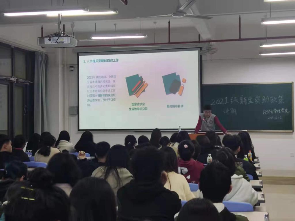12月12日晚,经管学院辅导员柯圣安在厚德楼416为2021级新生开展资助政策解读专项讲座及感恩励志教育。