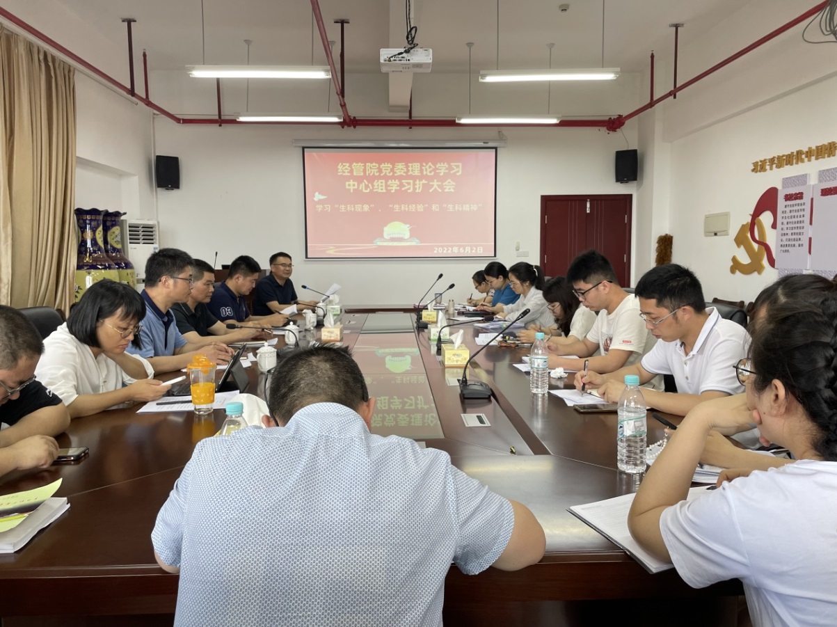6月2日下午,经管学院于厚德楼619召开党委理论学习中心组学习扩大会,学习“生科现象”“生科经验”“生科精神”。会议由院党委书记卢永衡主持,院党委委员、院科级干部、各支部书记、各系主任参加会议。