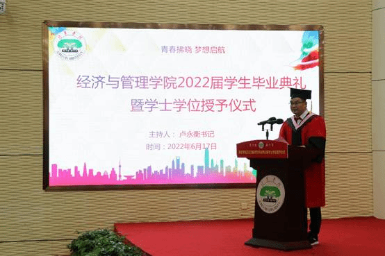 6月17日,经管学院在学术报告厅举行2022届学生毕业典礼暨学士学位授予仪式。学院全体教师、行政人员、辅导员以及2022届毕业生参加了典礼。毕业典礼由院党委书记卢永衡主持。