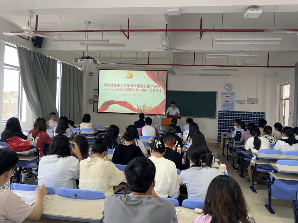 随后,马克思主义学院石玉昌博士为大家做了“学习《习近平谈治国理政》第四卷”专题辅导报告,报告以“推进社会主义文化强国建设的根本遵循”为主题,为大家解读《习近平谈治国理政》第四卷第十二篇导读部分的内容。他号召师生党员,要深刻领会、准确把握、切实贯彻习近平总书记关于推进社会主义文化强国建设的一系列最新重要论述,并将理论应用于工作学习实践,坚定信心、凝聚共识、统一意志,同心同德朝着实现伟大复兴的中国梦奋发前进。