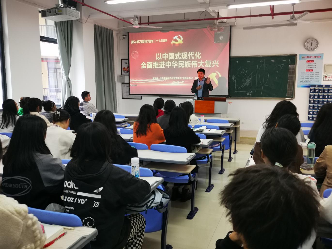 10月18日上午,院长黄可权为2022级工商管理类(3)班学生上思想政治课,与同学们分享了自己收看学习习近平总书记在中国共产党第二十次全国代表大会上所做的报告的心得体会。