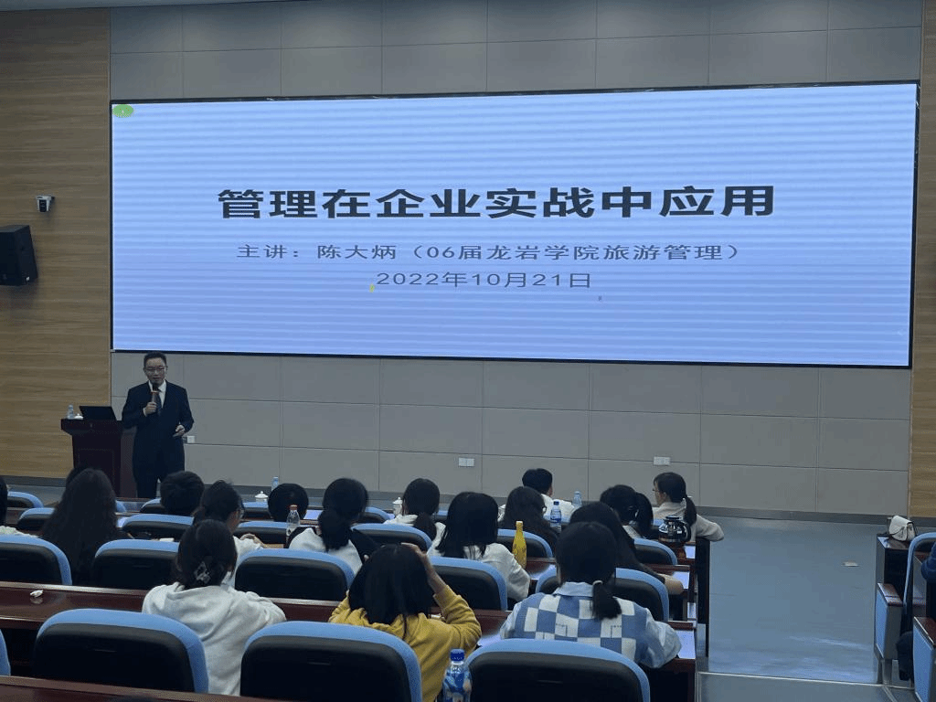 10月21日下午,经管学院邀请2006届旅游管理毕业生,现担任龙岩学院校友会福州分会副会长(主管分会策划工作)、禄可科技集团董事会办公室副主任(主持工作)兼兵商教育副总裁(集团高管级)、高级培训讲师的陈大炳校友,来到黄可权老师和卢宝蕊老师的《管理学》课堂,为2022级工商管理类1、2、3班的学弟学妹们,做《管理在企业实战中应用》及《企业团队一般会遇到的问题及解决思路》专题讲座。