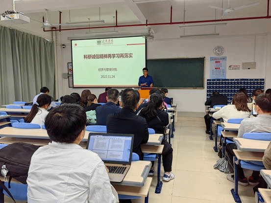 11月24日下午,经管学院利用召开全体教职工大会的时机,在厚401教室开展科研诚信精神再学习再落实活动。副院长郑国诜博士引导全体教职工回顾前几次学习贯彻“学校科研工作会议”关于学术不端行为和学术诚信教育的文件精神,分享了一些科研不端案例及其启示,指出务必高度重视诚信、力避科研负面典型发生,希望全体教师触类旁通、尽力而为、托高底线,既要重视科研项目、论文、著作、软著等的诚信问题,也要重视教研教改项目、教材、指导学生等的诚信问题,既要尽力完成现有的科研任务,也要尽力找准来年的科研方向,特别是要谋划好2023年的国家社科项目,既要遵守相关文件精神,也要与时俱进托高科研诚信底线。