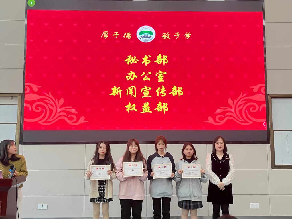 会上,综合各部门上一学期表现情况,对秘书部、办公室、权益部、新闻宣传部进行“优秀部门”表彰仪式。秘书部部长徐小煖作为优秀部门代表上台发言,分享秘书部工作的经验与做法,提出新学期的部门规划。