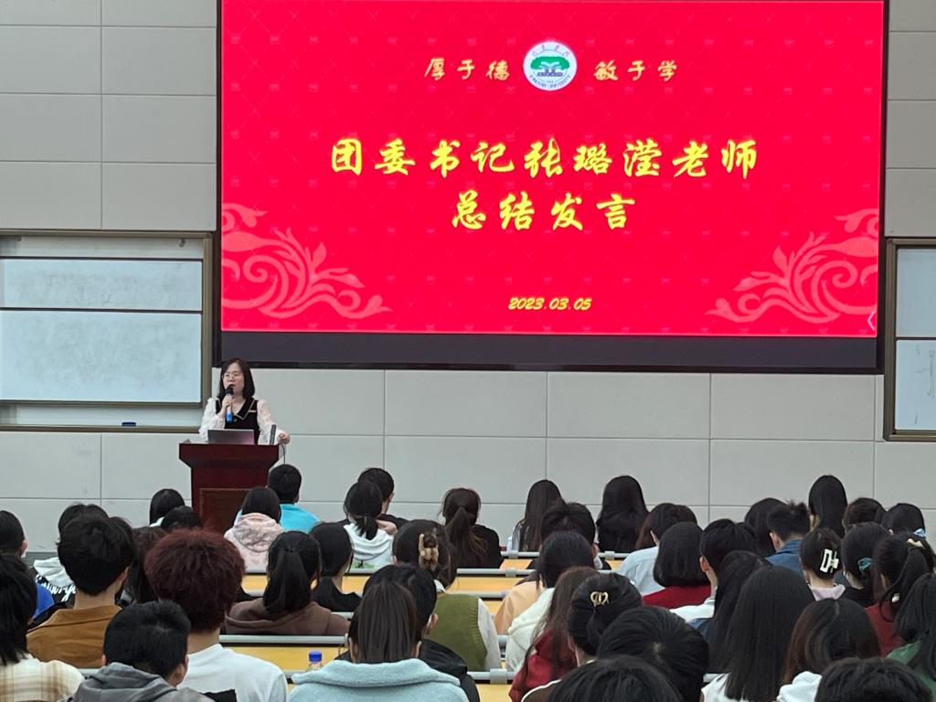张璐滢作总结发言,从工作态度、工作方式、问题现象三个角度对新学期团学工作提出详细要求,强调各部门要克服态度懒散、能力欠缺等不足,不断提升服务意识与工作能力,团学成员要合理安排时间,正确处理工学矛盾,做一名品学兼备的优秀学生干部。