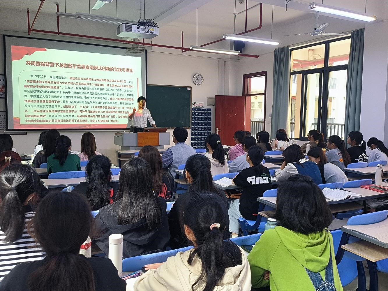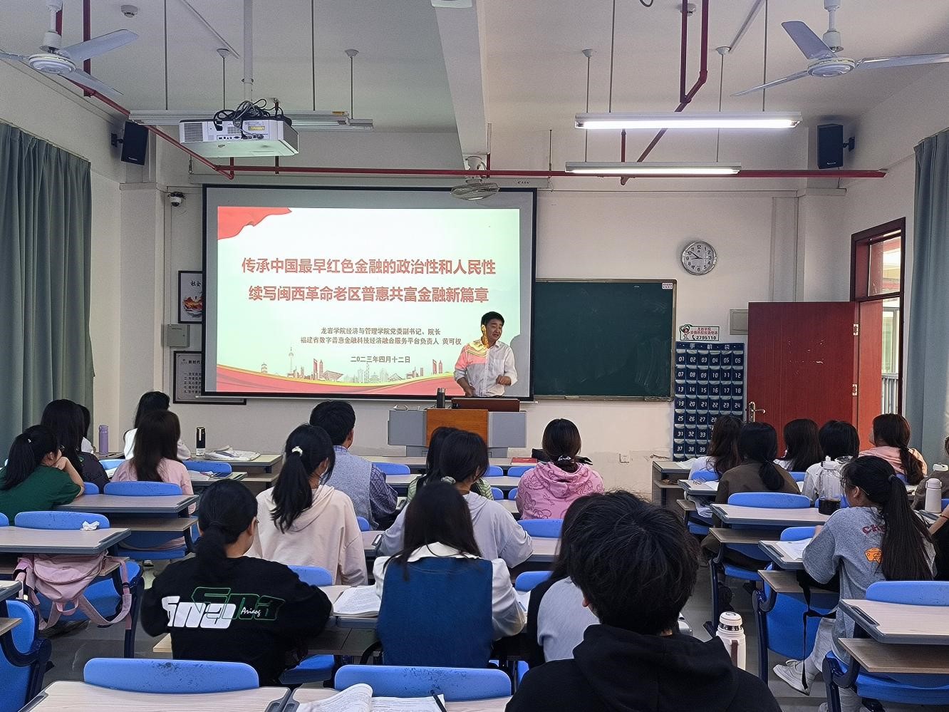 4月14日,经管学院院长、福建省数字普惠金融科技经济融合服务平台负责人黄可权教授以《传承中国最早红色金融的政治性和人民性续写闽西革命老区普惠金融新篇章》为题,为2022级经济与贸易类专业的140多名学生上思政课。