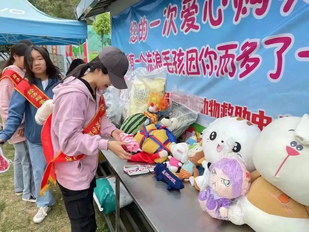志愿者积极清洁草坪卫生、陪伴流浪狗玩耍、在乐园门口引导领养人参观,同时组织现场组织义卖活动,为流浪狗筹集爱心救助款。