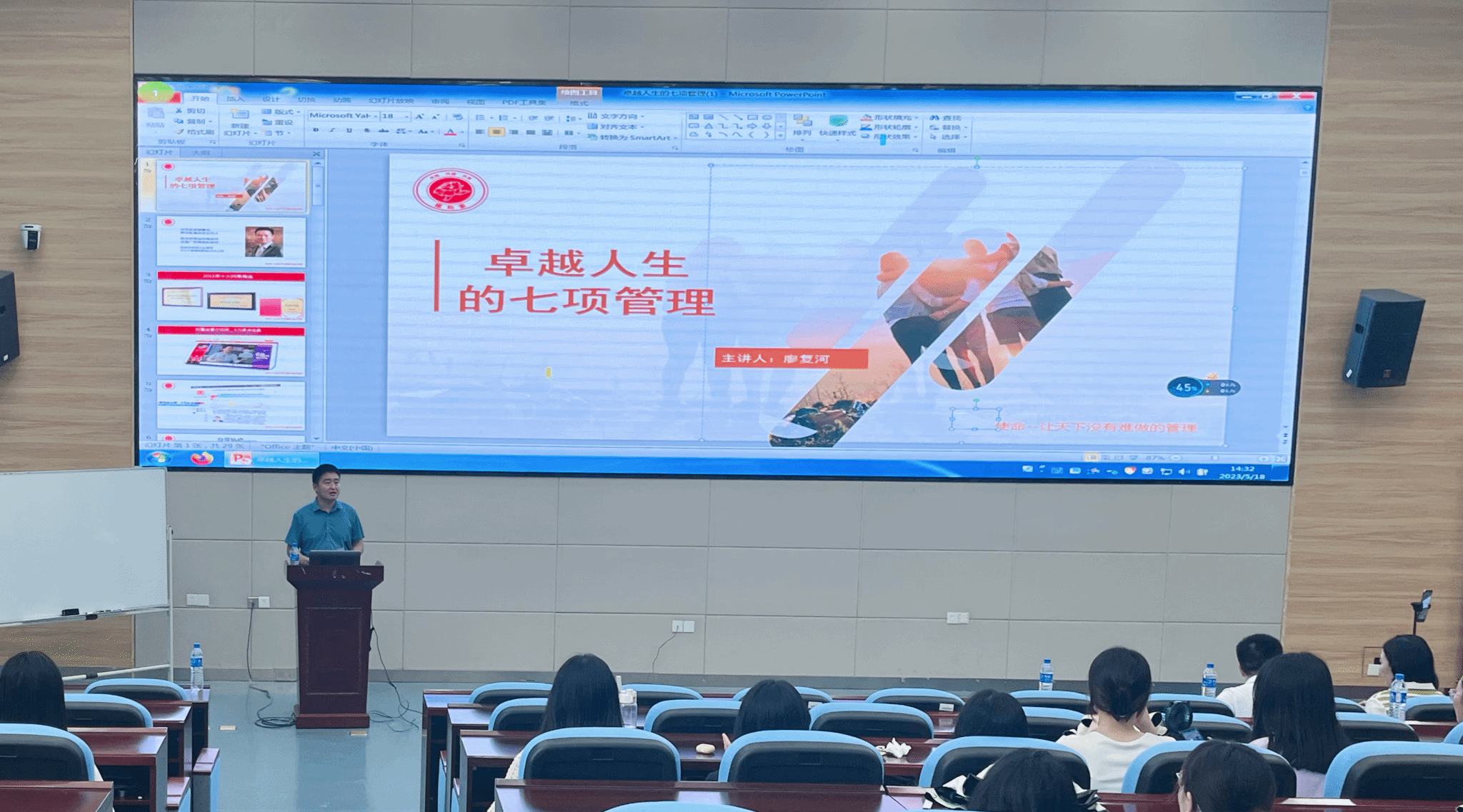 讲座中,廖复河结合自身从教到创业的经历,围绕青年大学生成长成才,分享了卓越人生的七项管理基本方法,具体包括梦想/目标管理、情商管理、知识管理、道德管理、关系管理、时间管理、行动管理等方面的核心内涵与实践路径。他指出,广大青年大学生首先要有“立大志,成大业”的梦想,要结合自身的定位敢想敢做,永葆积极、乐观、精进、奋发的精神状态,多学习多思考多行动,不负青春年华。他勉励大家“不管如何,让我们一起成就卓越的人生,一起成为对社会有贡献的人才”。最后,廖复河对学弟学妹们提出的有关就业创业和职业规划等问题一一给予了回应。