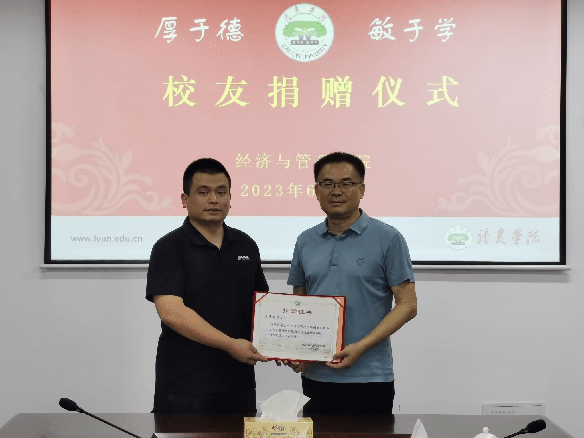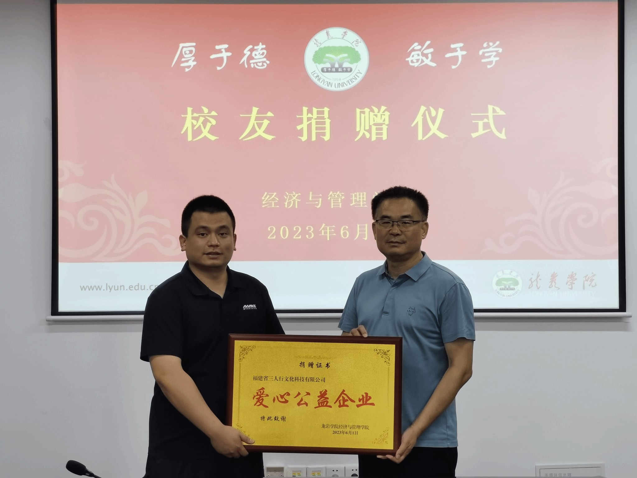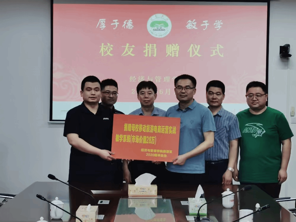 正值龙岩学院建校65周年之际,经管学院2020届旅游管理专业(专升本)校友谢玮鑫向学院捐赠一套市场价值28万元的《移动旅游电商运营实战教学系统》,向母校献上生日祝福。6月1日下午,捐赠仪式在经管学院厚德楼619举行,校友、福建省三人行文化科技有限公司营销总监谢玮鑫,经管学院党委书记卢永衡、校友会主任戴腾荣、副院长吴盛汉、副院长郑国诜以及教师代表出席了捐赠仪式。仪式由旅游管理系主任刘晓刚博士主持。