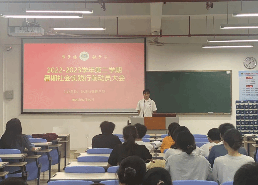 6月25日晚,经济与管理学院在厚301举行2022-2023学年第二学期暑期社会实践行前动员大会。本次动员大会由院团委学生会主办,科创实践部承办,各团队代表参加。