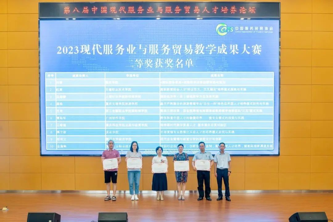 7月22日-23日,第八届中国现代服务业与服务贸易人才培养论坛暨2023现代服务业与服务贸易教育教学成果大赛在贵阳举行。我院被中国服务贸易协会专家委会授予现代服务业与服务贸易产教融合基地。院长黄可权教授在论坛做了《五聚力 六融合 深化新商科政产学研用协同育人机制构建》的主题交流,同时黄可权作为第一完成人参赛的《面向数字经济的“五聚力、六融合”新商科政产学研用协同育人机制创新与实践》荣获2023中国现代服务业与服务贸易教育教学成果大赛一等奖;我院蔡立雄教授作为第一完成人参赛的《市场营销专业数智化兴农人才的培养模式研究与实践》获得2023中国现代服务业与服务贸易教育教学成果大赛二等奖。
