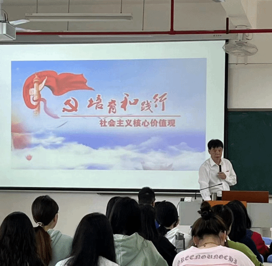 戴腾荣以习近平总书记关于社会主义核心价值观重要阐述切入主题。着重介绍了社会主义核心价值观的形成、为什么要坚持社会主义核心价值观以及从国家、社会、个人三个层面解释了如何理解社会主义核心价值观的丰富内涵和实践要求。