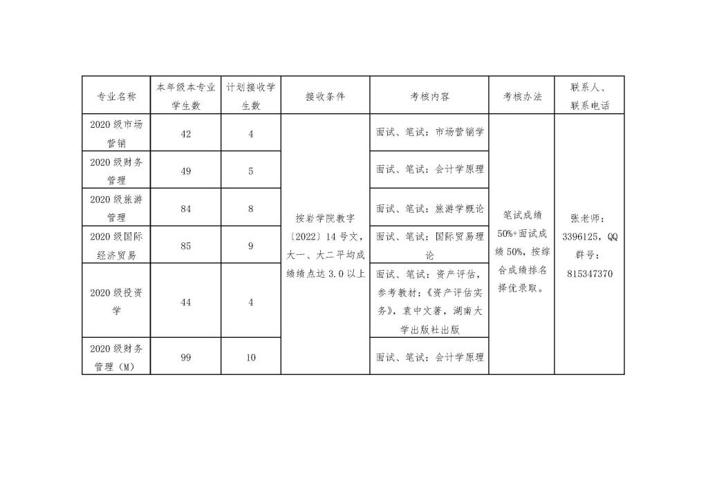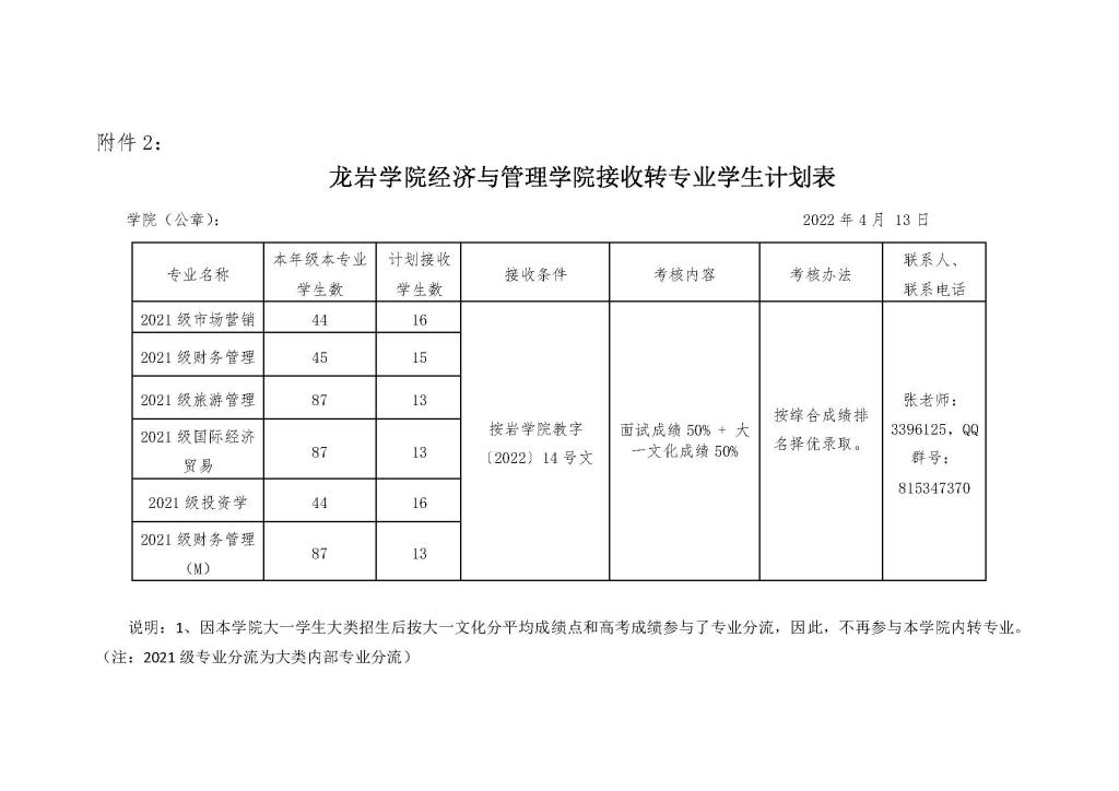 龙岩学院经济与管理学院接收转专业学生计划表