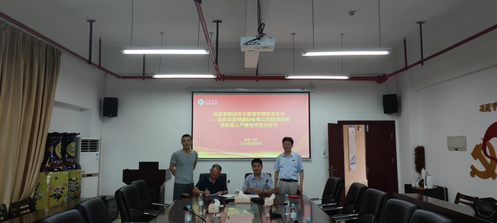5月18日下午,恰逢龙岩学院建校63周年前夕,龙岩学院经济与管理学院校友企业——龙岩市英明建材有限公司回馈母校协同育人产教合作签约仪式在厚德楼619会议举行。经管学院校友——龙岩市英明建材有限公司董事长罗剑明,经管学院常务副院长黄可权、教学副院长吴盛汉,以及罗剑明校友当年授课教师戴腾荣教授、曹阳副教授等有关人员参加签约活动。