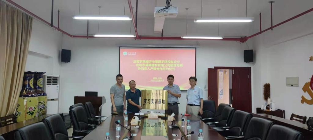 黄可权代表经管学院与罗剑明校友签订了《龙岩学院经济与管理学院—龙岩市英明建材有限公司产教合作协同育人协议框架》,并为龙岩市英明建材有限公司颁发了龙岩学院经济与管理学院实习实训基地牌匾。同时,吴盛汉为罗剑明校友颁发了经管学院专业指导教师聘书。
